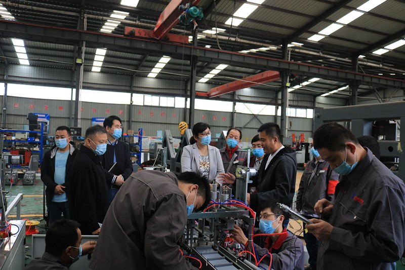 逯明書(shū)記一行首先來(lái)到了生產(chǎn)車(chē)間,現(xiàn)場(chǎng)考察企業(yè)在常態(tài)化疫情防控下的復(fù)工復(fù)產(chǎn)情況和面臨的困難。在裝配調(diào)試區(qū),逯書(shū)記詳細(xì)了解了一拖二全自動(dòng)口罩機(jī)、高速數(shù)控角鋼鉆孔生產(chǎn)線、新型高速數(shù)控角鋼沖孔打字剪切生產(chǎn)線等設(shè)備的裝配調(diào)試情況和生產(chǎn)過(guò)程中遇到的困難。